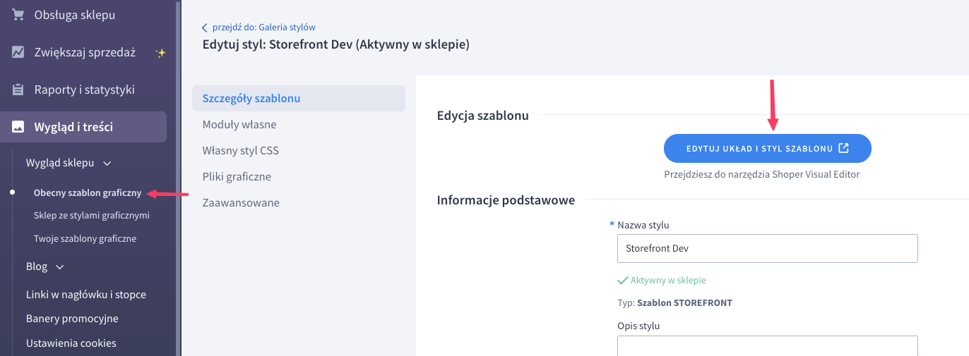 Wejdź do menu "Wygląd i treści" > "Wygląd sklepu" > "Obecny szablon graficzny" i kliknij "Edytuj układ i styl szablonu".