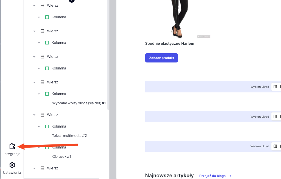 - Otworzy się edytor Storefront. Wybeirz integracje i wyszukaj na liście "Pinterest". Kliknij w ten moduł.