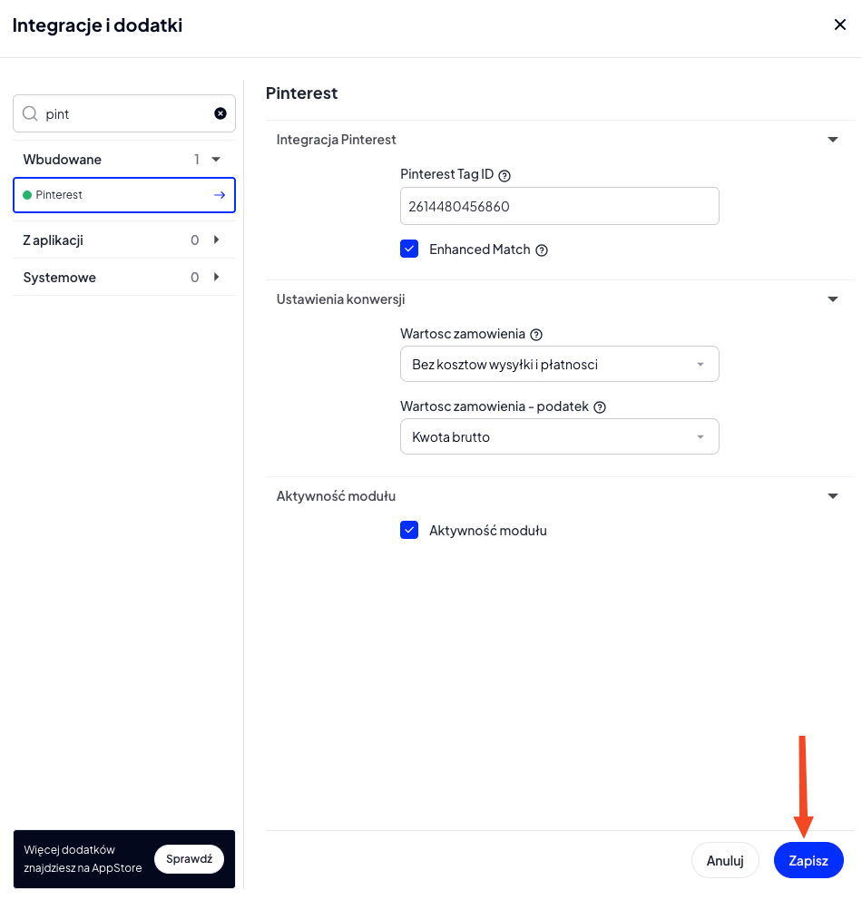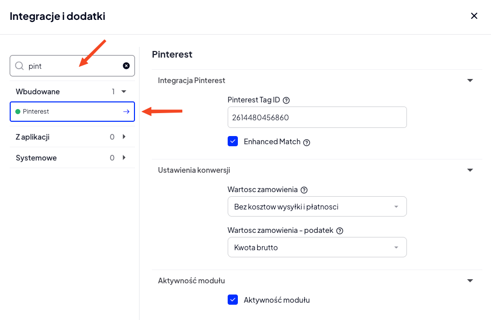 - Pinterest Tag ID - identyfikator Pinterest Tag skopiowany z panelu Pinterest Ads